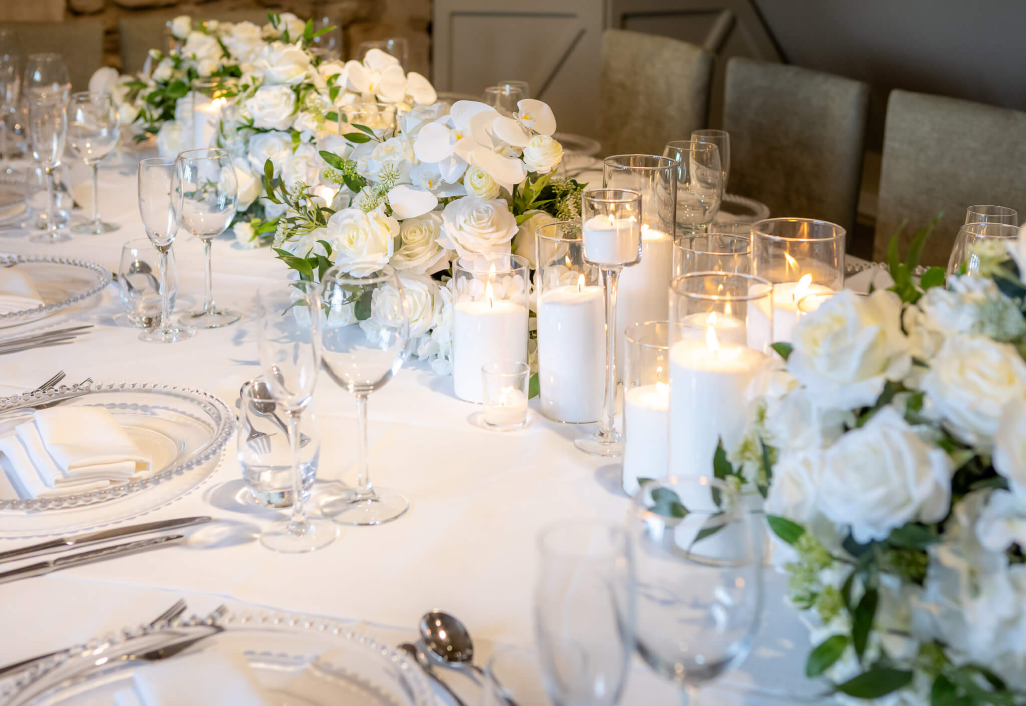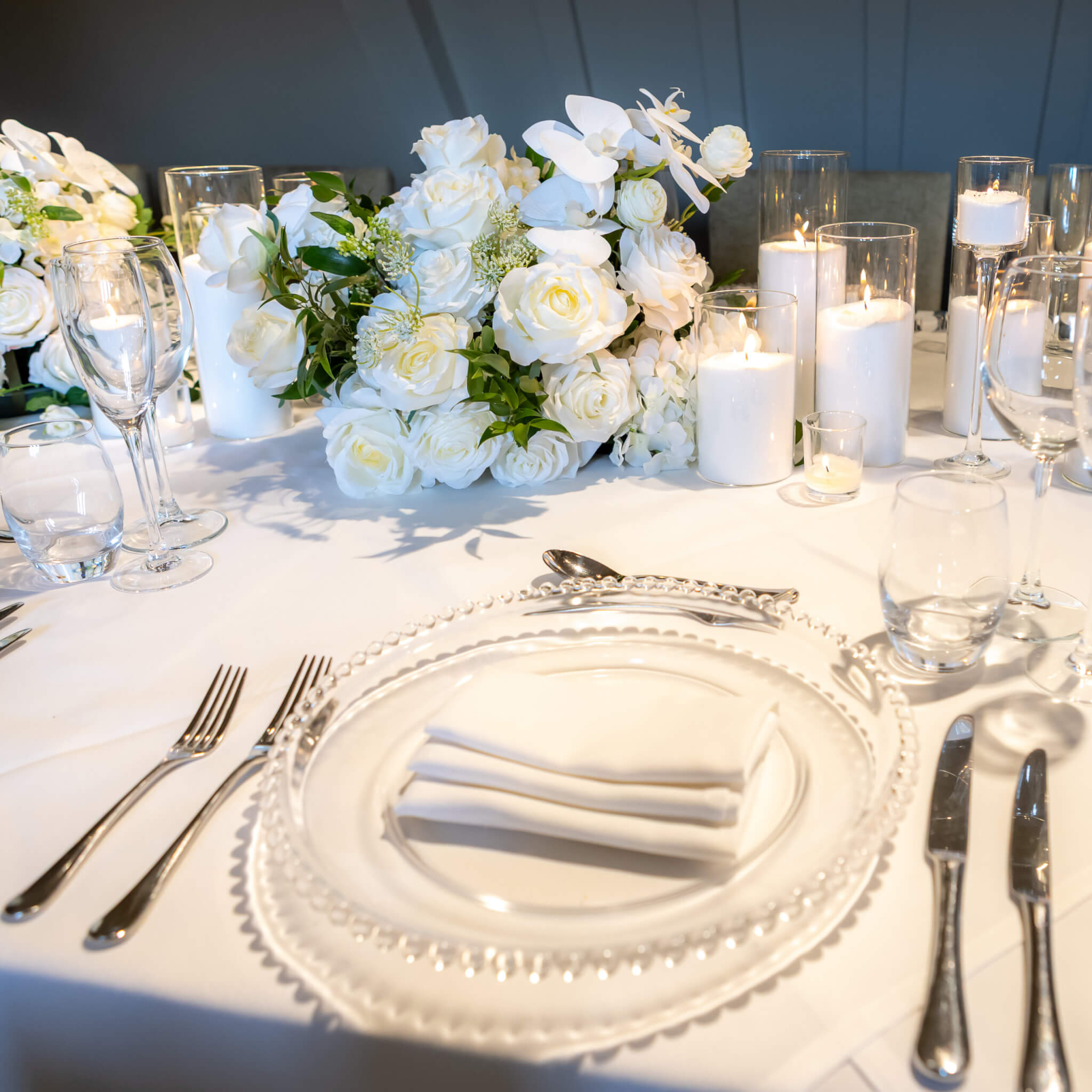 - Crisp white table linen